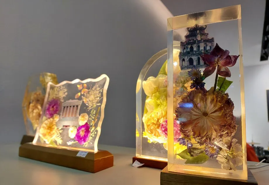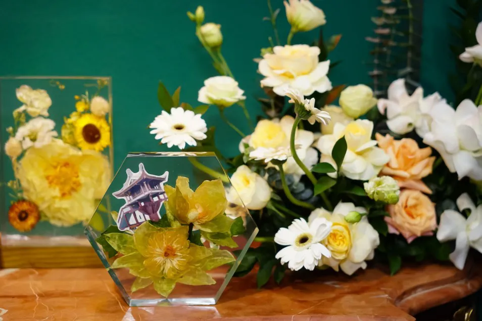 Hanoi-based artist Thu Hien uses epoxy casting technology combined with the art of dried flower preservation to create beautiful flower lamps that capture the enduring beauty of fresh flowers and iconic Hanoi landmarks such as the Turtle Tower, Thang Long Imperial Citadel, and Ho Chi Minh Mausoleum.