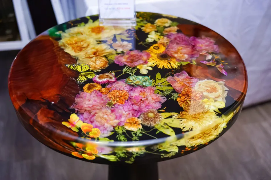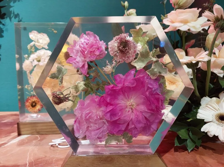 "First, I choose flowers with bright colors and thick petals, then I incubate them in silica gel for five to seven days so that the dried flowers retain their color. Then I pour layers of epoxy glue into the mold, arrange the flowers, and add more background glue. I wait a few days for the glue to dry, then take the mold apart and polish it. After 13 steps of polishing, the product is attached to the base and becomes a flower lamp," Hien said.