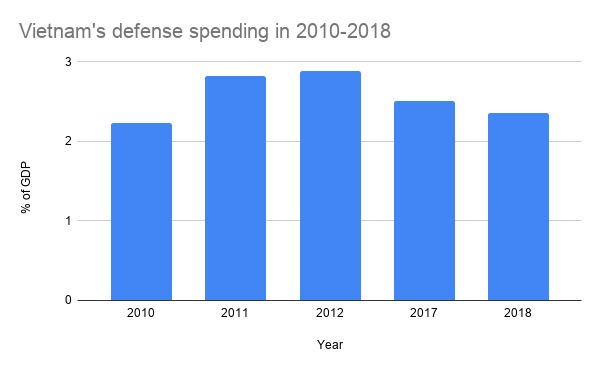 In its White Paper released in 2019, Vietnam reveals spending for defense accounted for 2.23% of GDP in 2010, 2.82% in 2011, 2.88% in 2012, 2.51% in 2017, and 2.36% in 2018.