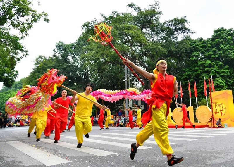| Dragon dance performance at Hoan Kiem lake walking street. Photo: Duy Linh |