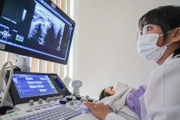 A Vinmex doctor checks the health of her patient on a GE ultrasound.