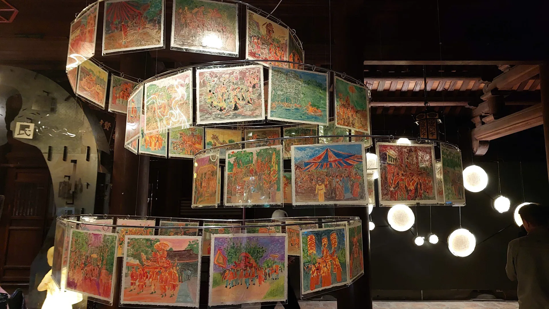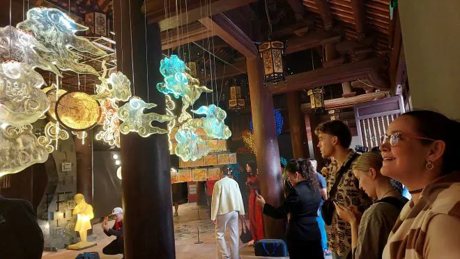 Flying Clouds, Blooming Flowers by artist Vu Xuan Dong draws inspiration from Ly Dynasty patterns. It blends imagery of examinations, historical figures and Thang Long festivals to form a shimmering “spring of knowledge” suspended above, celebrating learning and talent.