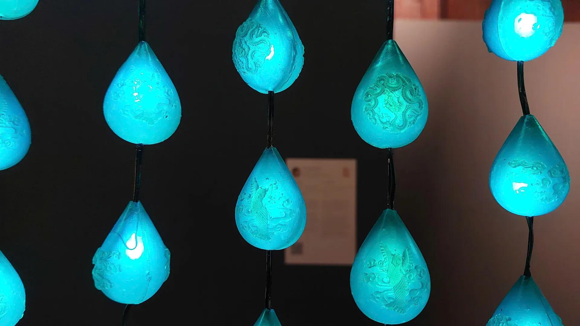 The artwork takes shape from the image of a lamp formed like a droplet, suggesting water, ink and the sweat of scholars past and students today.