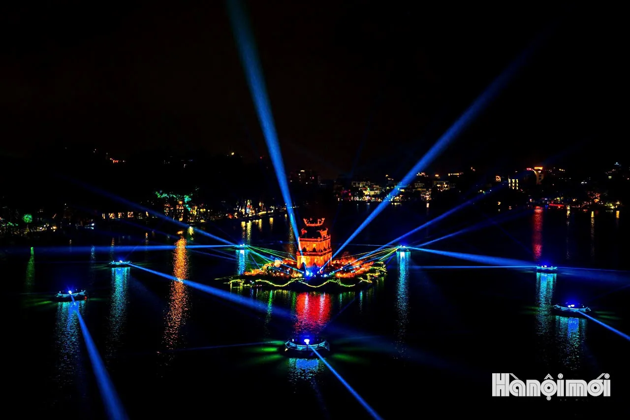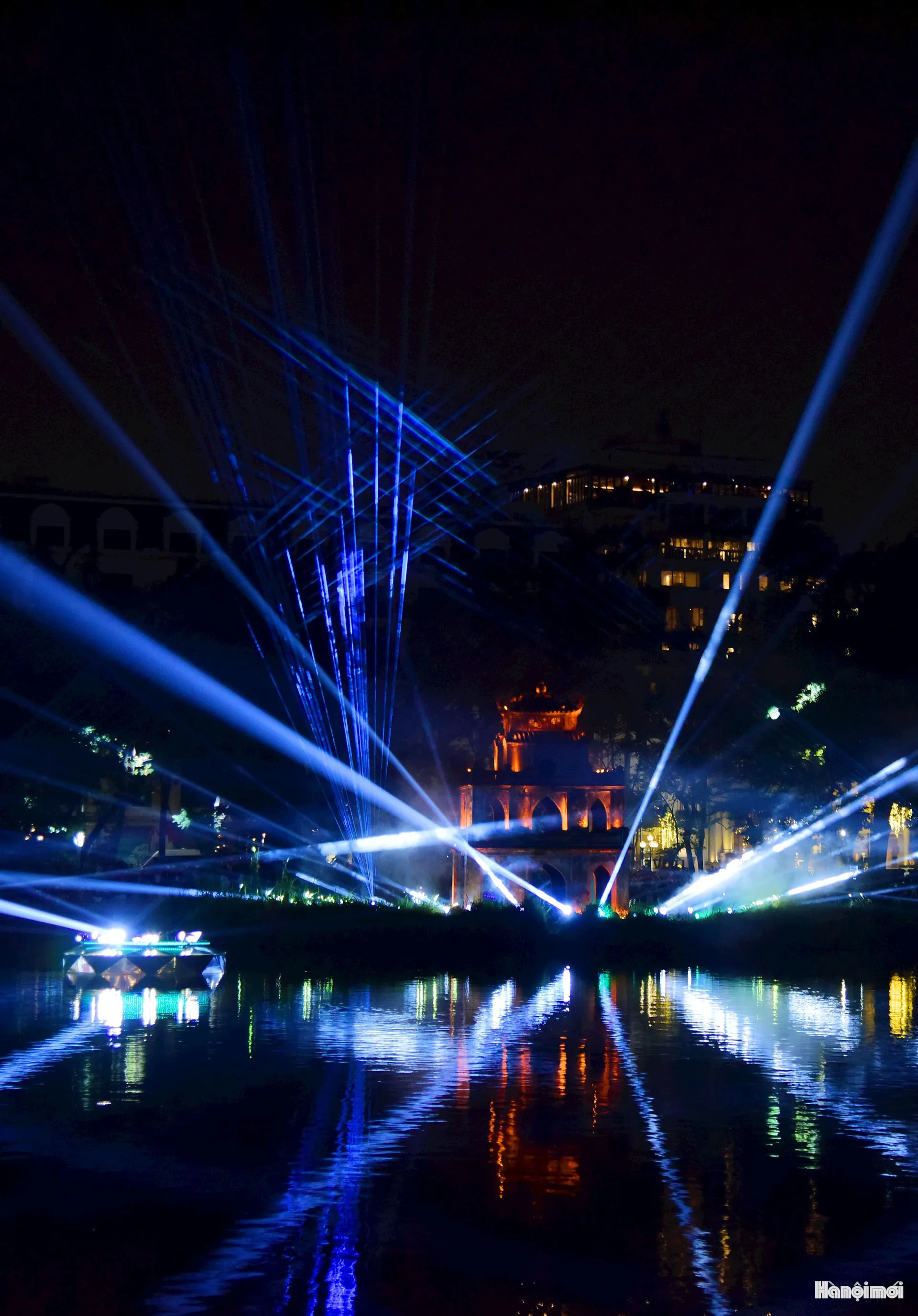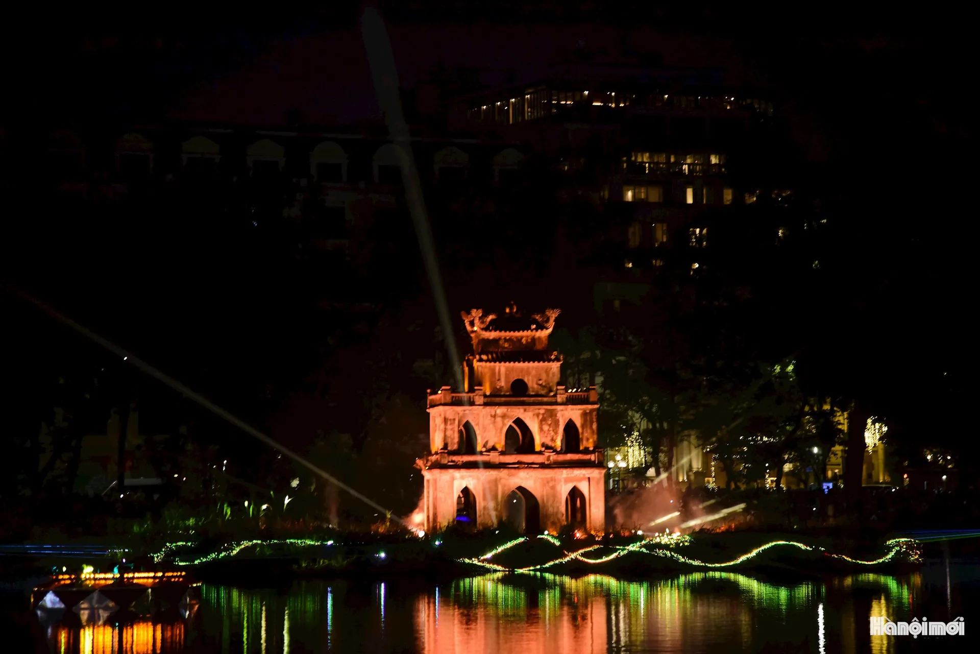 Many residents and visitors gather to admire the lighting at Hoan Kiem Lake and Turtle Tower. Interwoven shades of blue, red and yellow wash over the Turtle Tower, creating a poetic and serene image that highlights the iconic structure within the peaceful holiday night of Hoan Kiem Lake.