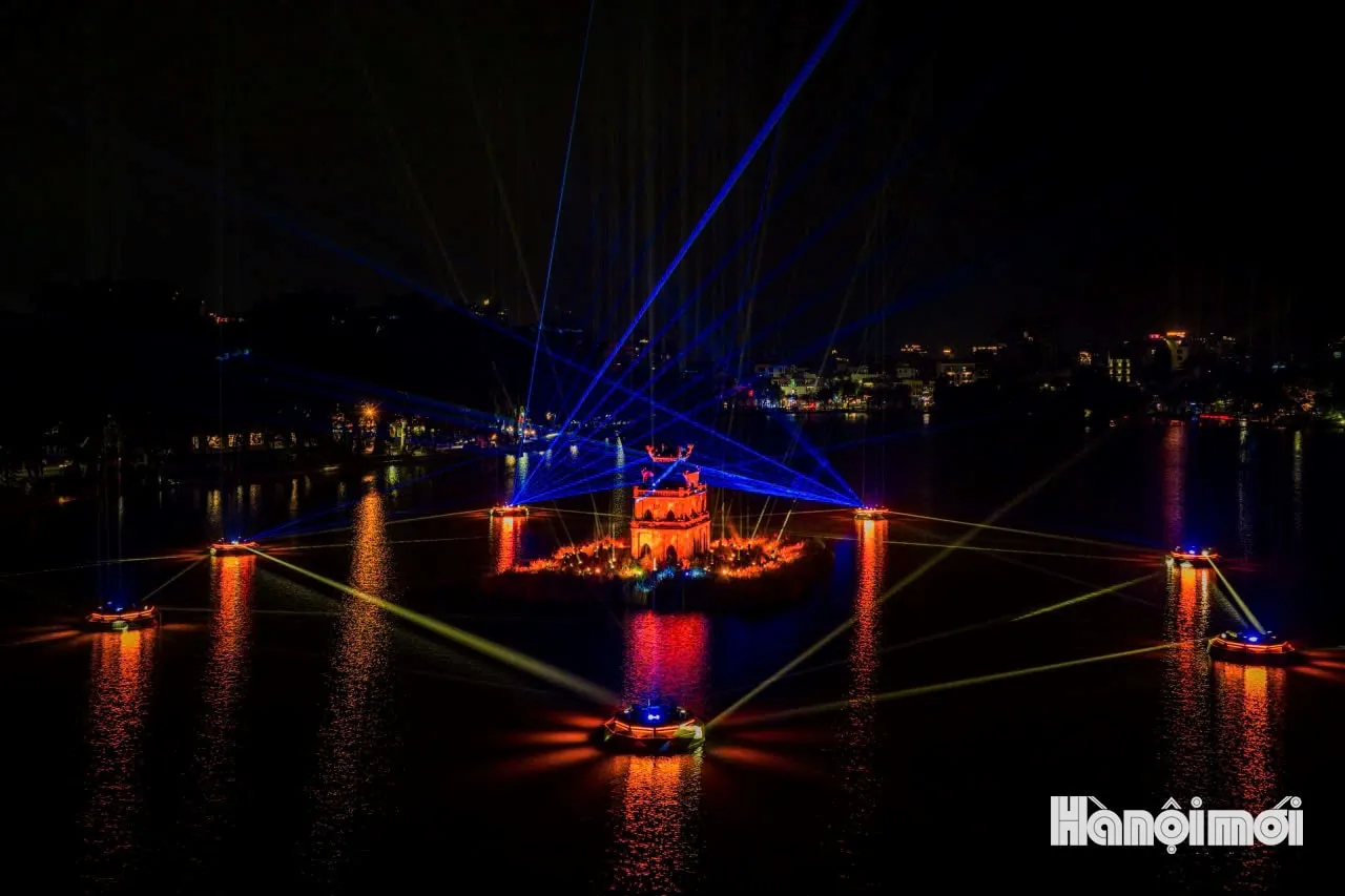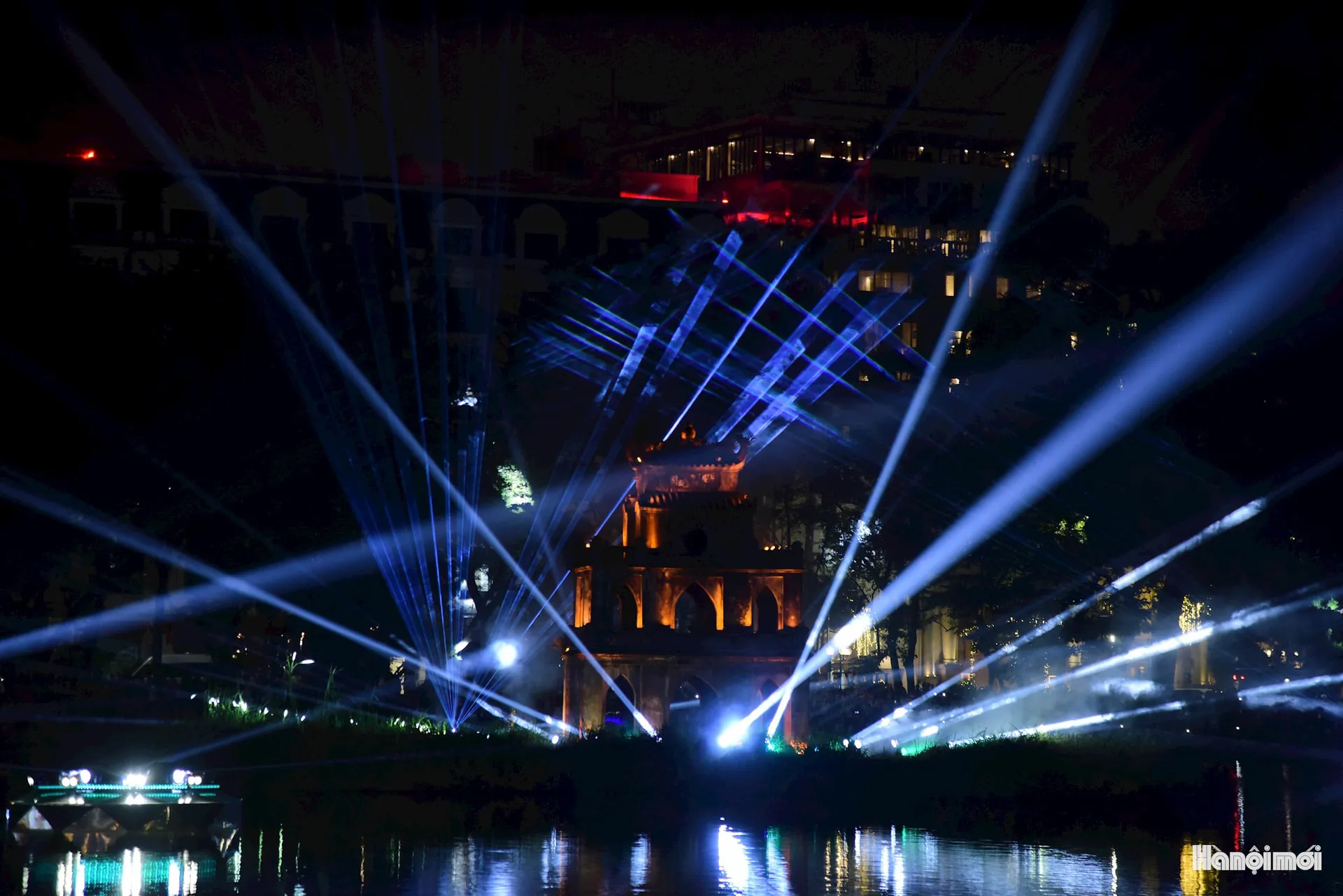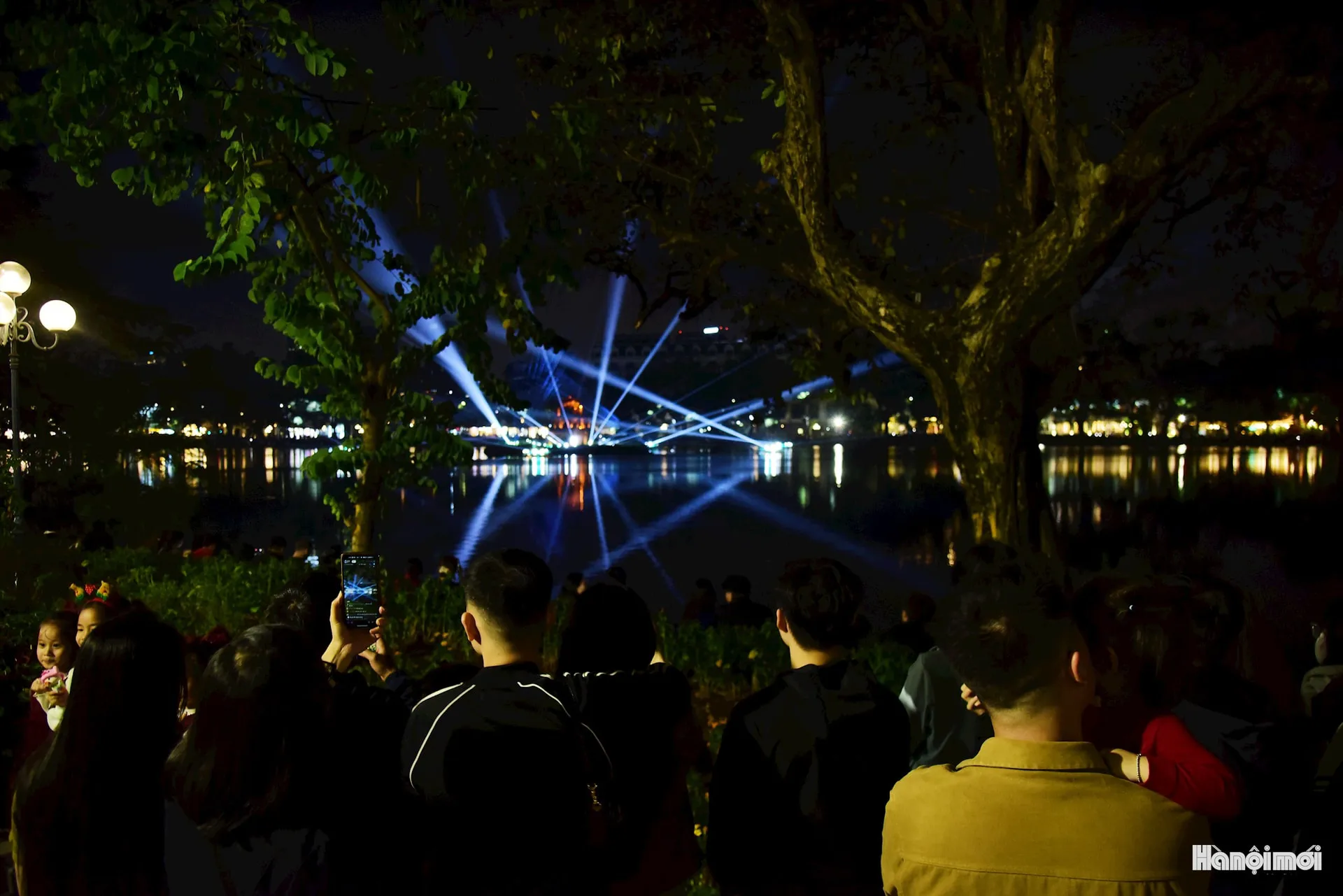Many residents and visitors gather to admire the lighting at Hoan Kiem Lake and Turtle Tower. Interwoven shades of blue, red and yellow wash over the Turtle Tower, creating a poetic and serene image that highlights the iconic structure within the peaceful holiday night of Hoan Kiem Lake.