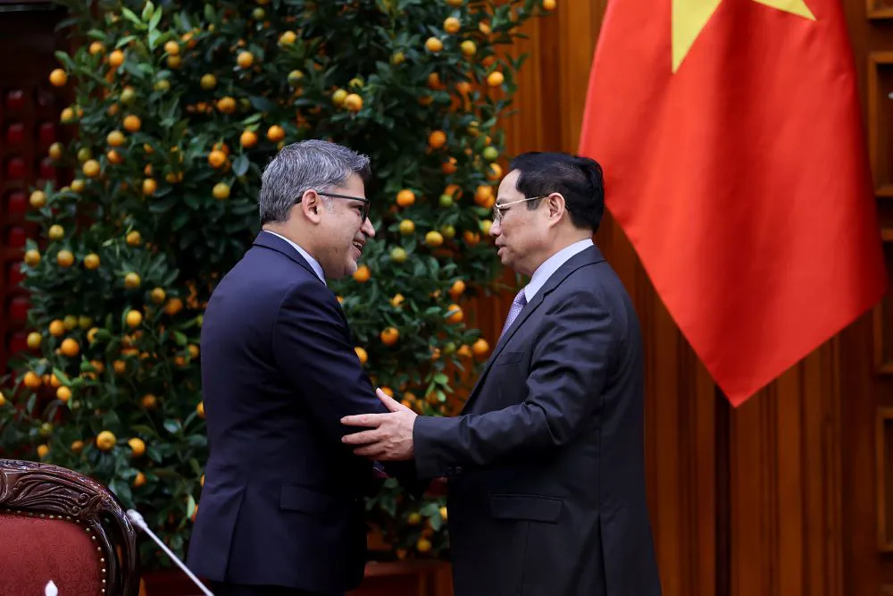 | Vietnam's Prime Minister Pham Minh Chinh (R) and Nitin Kapoor, Chairman and General Director of AstraZeneca Vietnam & Frontier Markets at a meeting in Hanoi on Jan 19. Photo: VGP |
