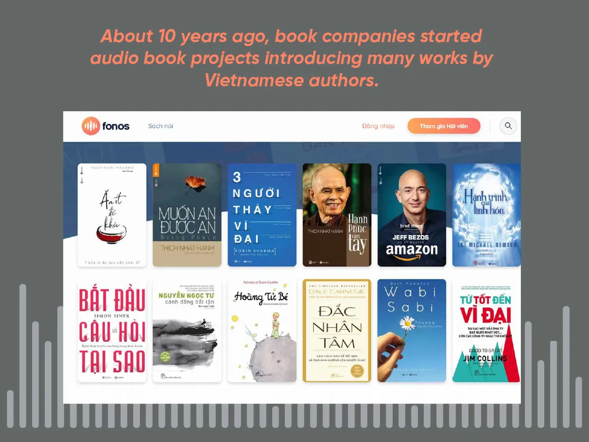 Voiz FM and Fonos are Vietnam's first two copyrighted audiobook platforms, both launched in 2020. Currently, Voiz FM offers nearly 2,000 titles on a variety of topics. Fonos produces about 20-30 audiobooks every month. The process is laborious and there are only a few books available at any given time, but CEO Xuan Nguyen said Fonos' products are high-end because they are created through a meticulous and time-consuming process.