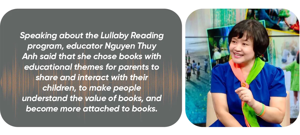 Speaking about the Lullaby Reading program, educator Nguyen Thuy Anh said that she chose books with educational themes for parents to share and interact with their children to make people understand the value of books and become more attached to books. Thuy Anh said this program also aims to spread Vietnamese literature and language to children abroad.