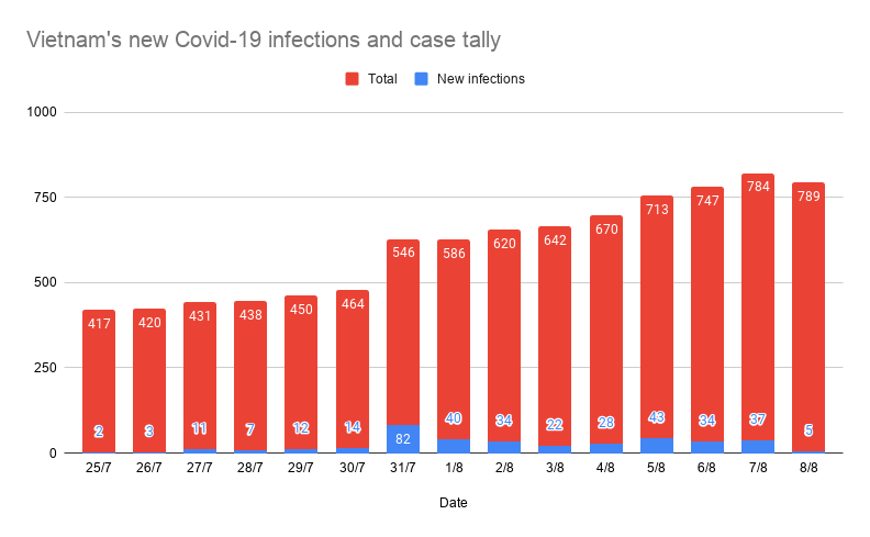 August 8: Vietnam’s Covid-19 tally hits 789, more cases linked to Danang