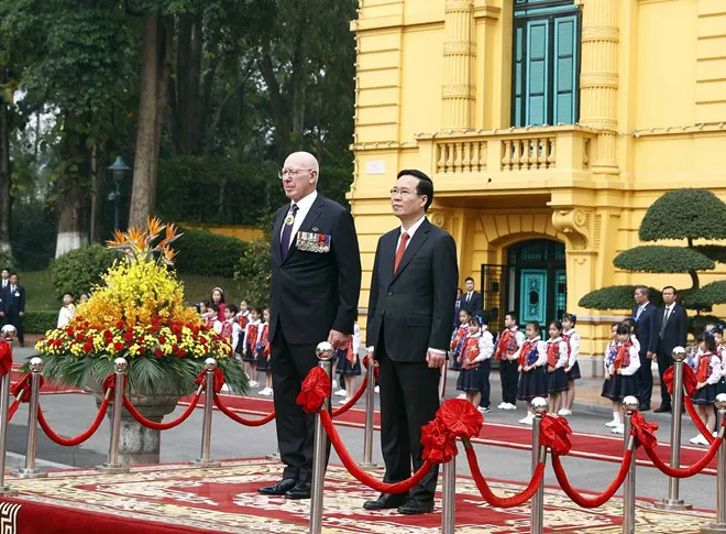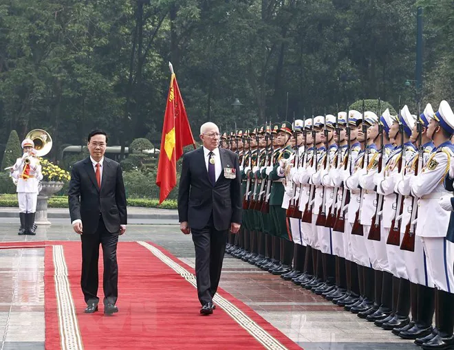 | Vietnamese President Vo Van Thuong receives Australian Governor-General David Hurley at the ceremony. |