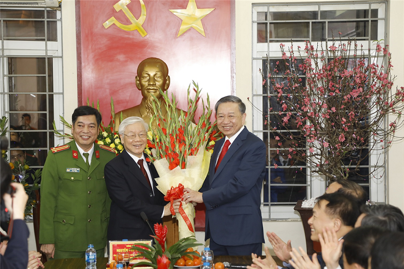 Party General Secretary Nguyen Phu Trong (center) and Minister of Public Security To Lam (right) visited the Ba Dinh District Police in 2019. Photo: anninhthudo.vn |