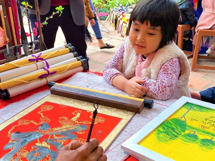 Craft and folk art workshops include making lucky money envelopes and paper fans, pottery, folk painting prints, calligraphy, sedge grass weaving and scented candle making.