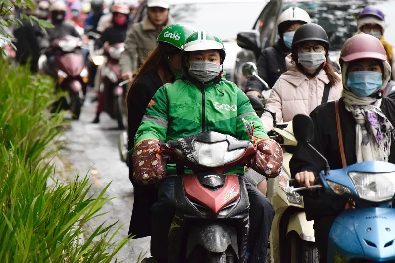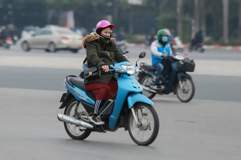 | Ride hailing motorcycle drivers wear seasoned clothes to keep themselves warm.