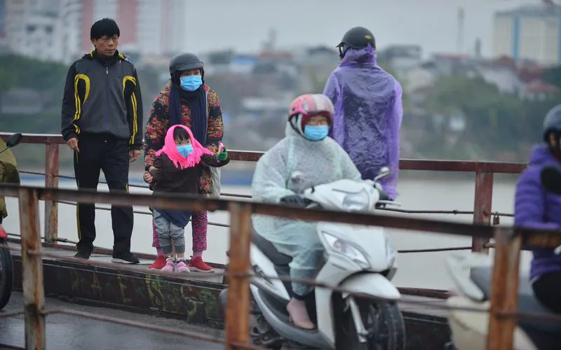 | Pedestrians are careful when taking children to school along Long Bien bridge in Hanoi which is prone to high and gusty winds.