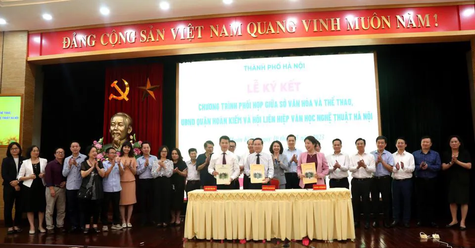 | The signing ceremony between the Hanoi Literature and Arts Union (HLAU), the Hanoi Department of Culture and Sports and the People's Committee of Hoan Kiem District. Photo: Kinhtedothi.vn |