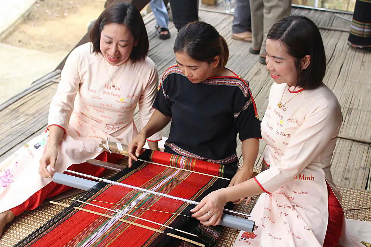 Visitors experience brocade weaving at the Ede ethnic village. Photos: Lao Dong Newspaper