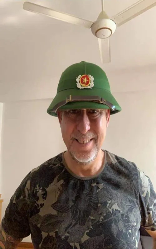 Paul Evans is happy when wearing a hat of a male farmer in Duong Lam.