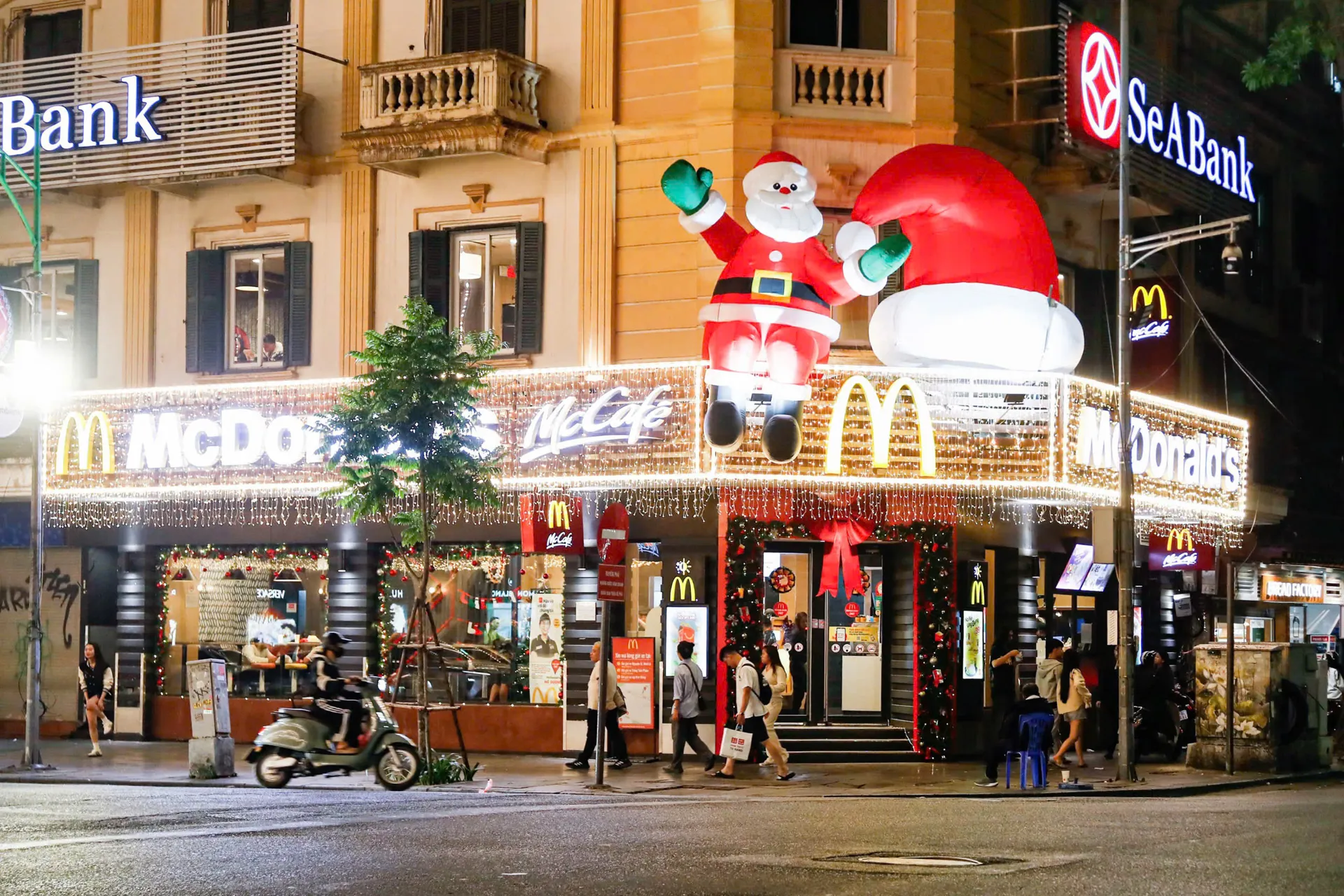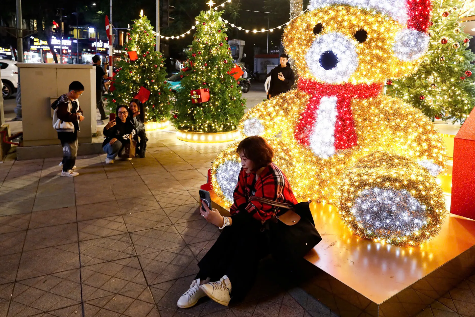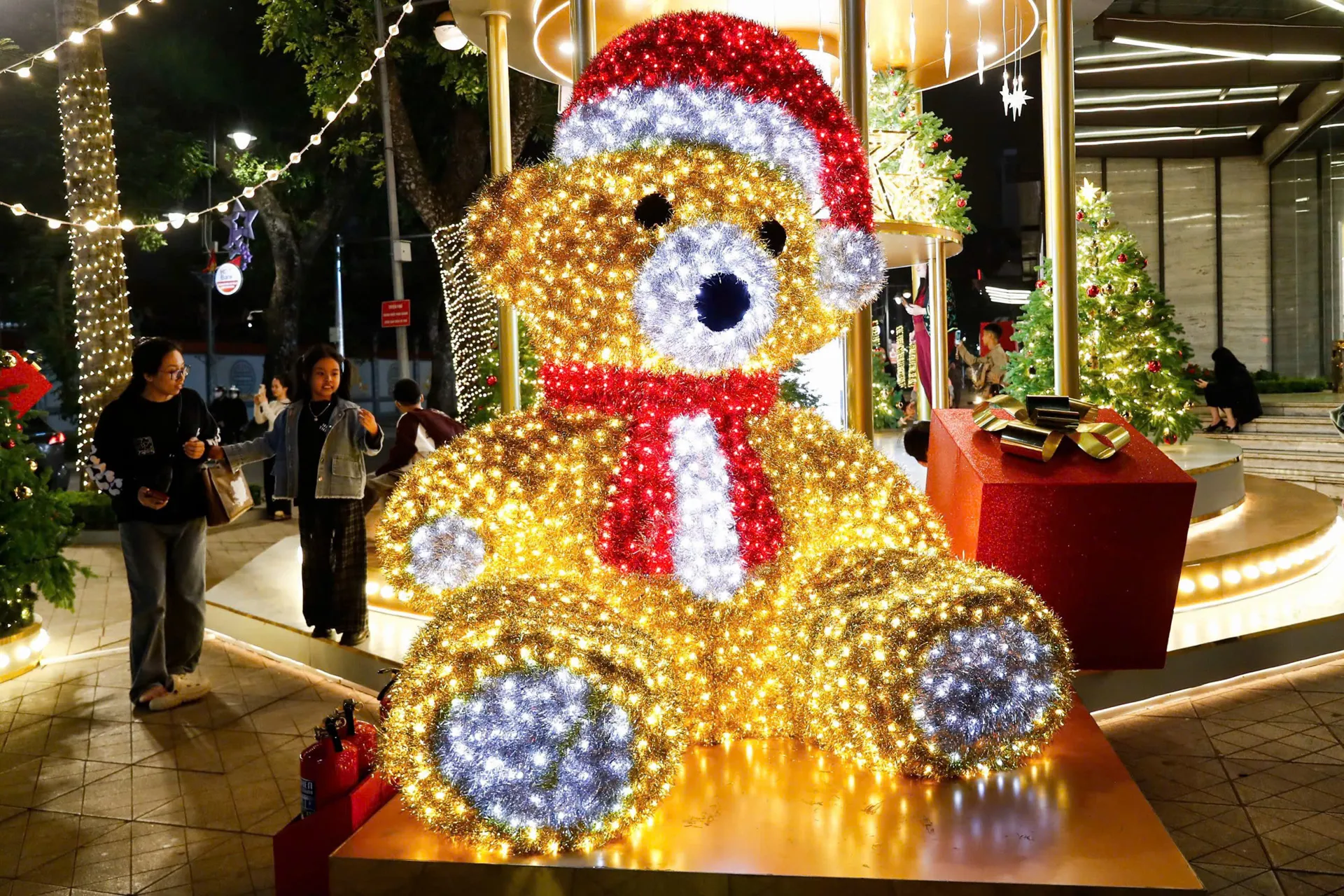 Meanwhile, Vincom Ba Trieu Shopping Mall dazzles visitors with a giant Christmas tree surrounded by playful displays, including an eye-catching Christmas bear installation.
