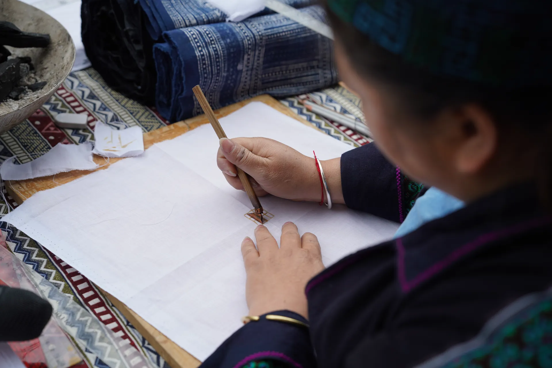 According to Lan, the most difficult step is heating the wax to the right temperature so it melts evenly and adheres firmly to the fabric. These simple-looking actions carry indigenous knowledge passed down through generations.