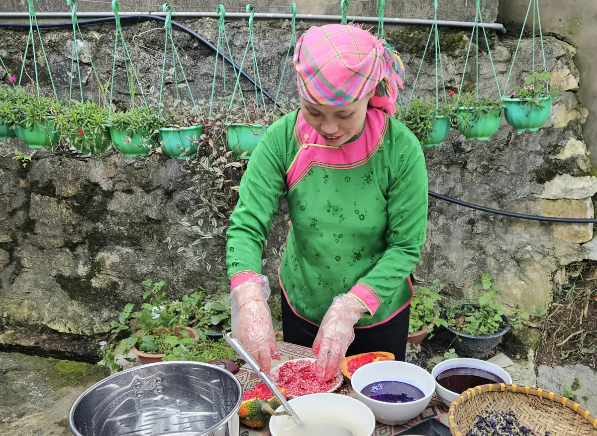 In another corner of a small house in the valley, San Thi Lan, a Giay woman participating in the experiential tourism model, prepares ingredients for five colored sticky rice. “Guests watch the process unfold and share the meal on the spot.”