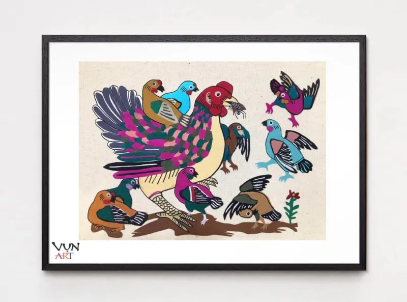 Along with folk art patterns like famous Dong Ho paintings, mosaic cloth paintings of Vun Art Cooperative also depict children theme, countryside landscape, and others. Besides paintings, the business also makes t-shirts, tote bags, wallets and cards, which enjoy great acceptance from clients.