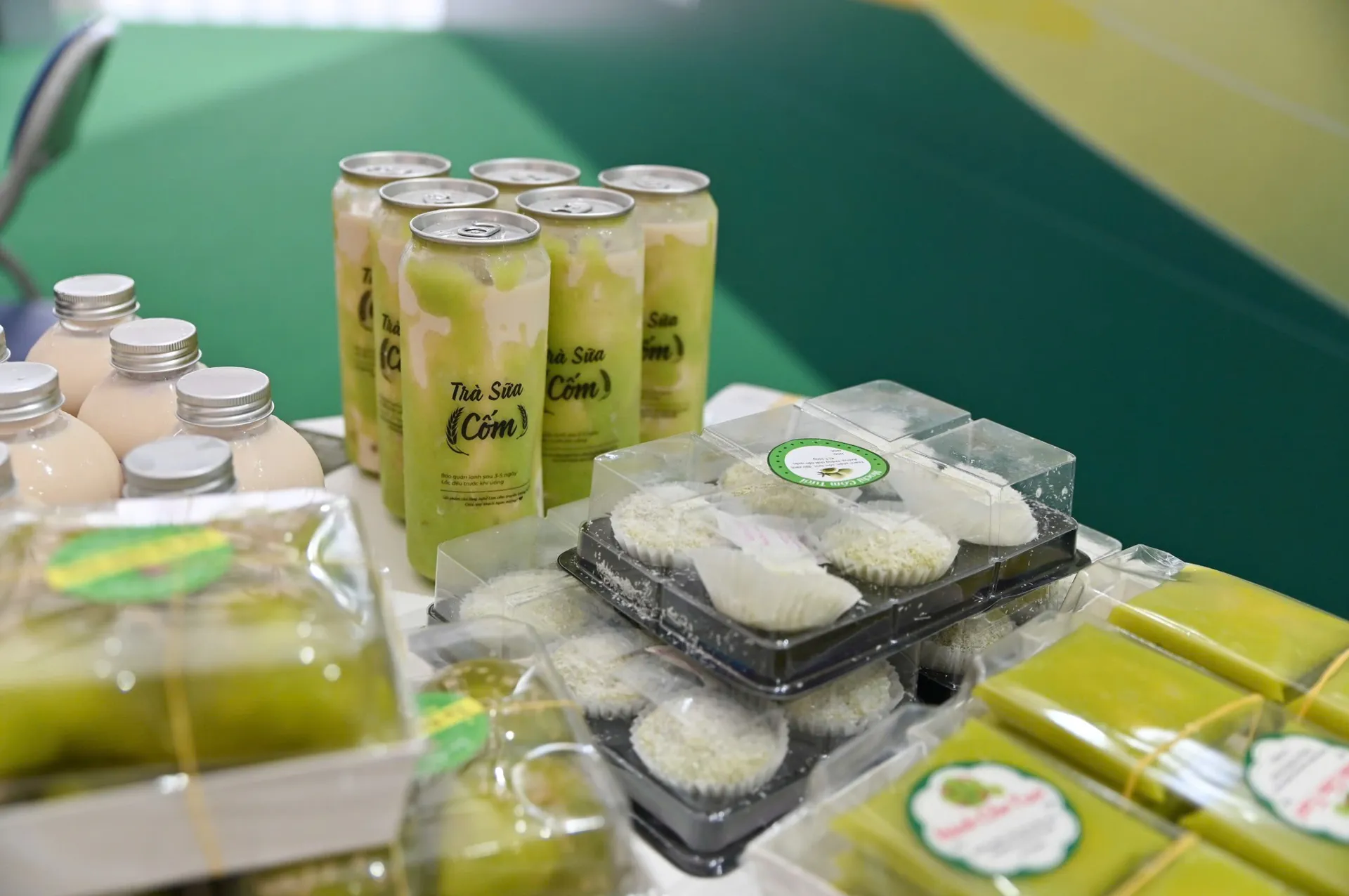 Seasonal snacks of green rice flakes and milk are displayed at the “Essence of Hanoi Autumn” zone.
