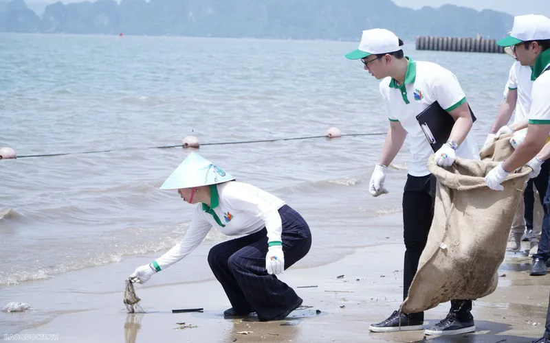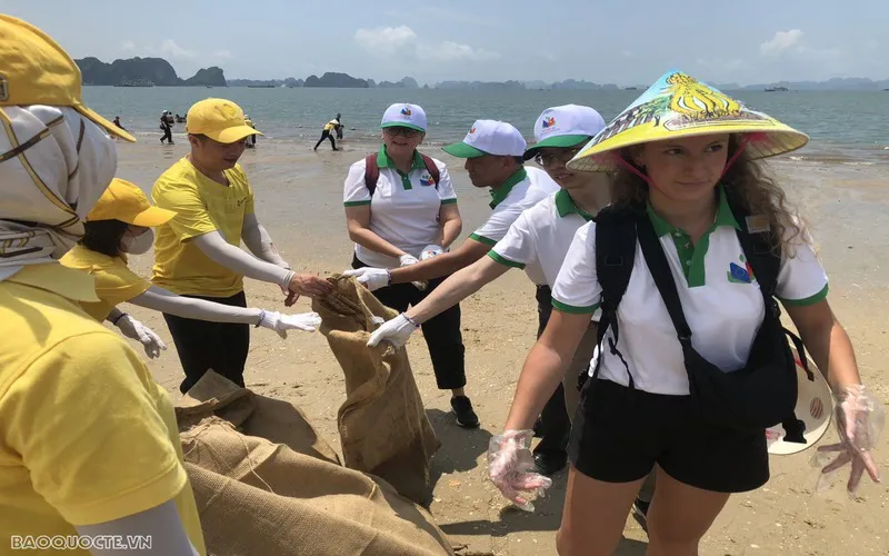 Deputy Minister of Foreign Affairs Le Thi Thu Hang and delegates take part in litter-picking activities at Bai Chay Beach and Ha Long Bay. |