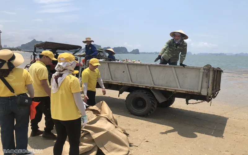 The delegation joined by many residents and tourists participate in the trash collection along Bai Chay Beach and Ha Long Bay. |