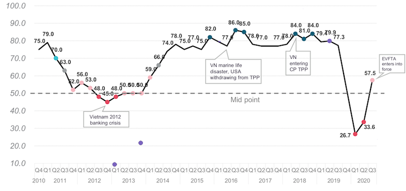 In Q1 of 2020, when Covid-19 first hit international trade and investment, the BCI fell to 26 points. It saw a slight increase in Q2 as Vietnam became one of the global success stories in containing the pandemic. Now, with businesses able to operate with far fewer restrictions and the EU-Vietnam Free Trade Agreement (EVFTA) entering into force on August 1, the confidence of European business leaders has seen a strong resurgence.