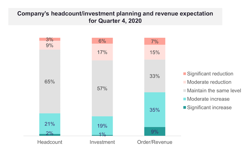 Q4 looks to be even more promising, with 44% predicting a strong end to 2020. Meanwhile, most companies are anticipating stabilization in their headcount (65%) and investment plans (57%), with just under half (44%) expecting to see an increase in their revenue and orders.