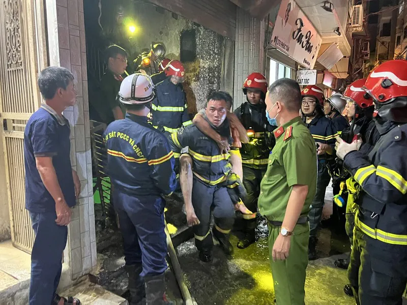 | Firefighters during a rescue operation at a fire scene on Phuc Tan Street, Hoan Kiem District. Photo: Dat Le/The Hanoi Times |