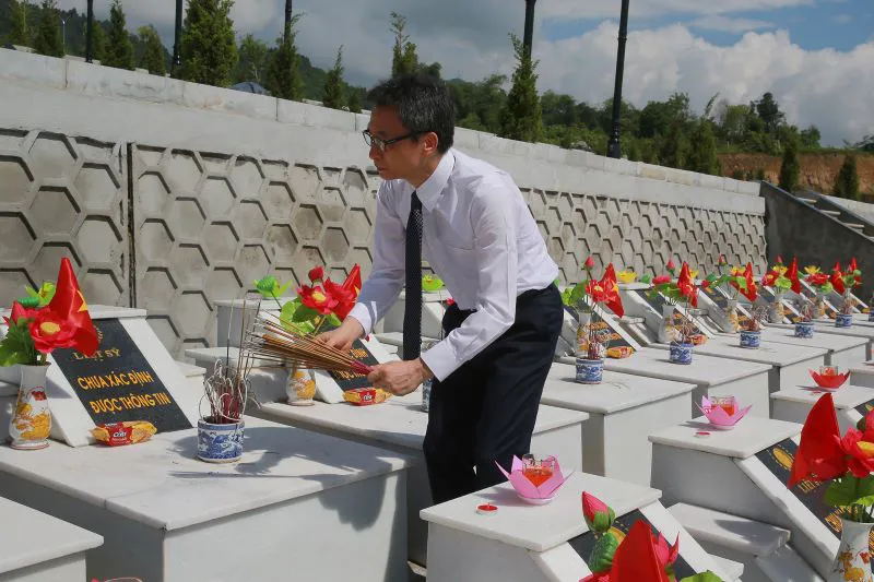 | Deputy PM Vu Duc Dam offers incense to the fallen combatants at the Vi Xuyen National Martyr Cemetery. |