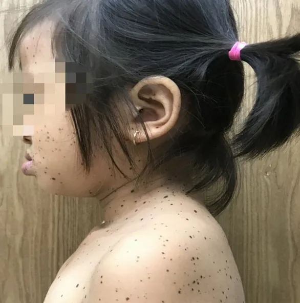 The body of the girl diagnosed with LEOPARD syndrome appears with multiple brown skin spots (lentigines). Photo: Ho Chi Minh City Dermatology Hospital |