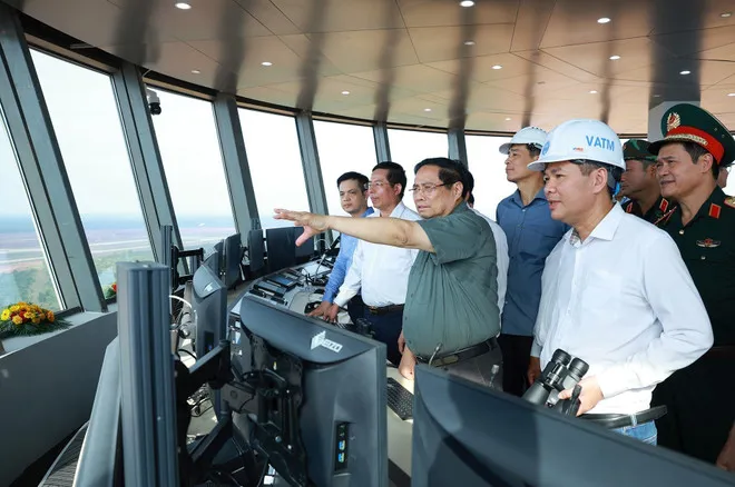 Prime Minister Pham Minh Chinh inspects the Long Thanh International Airport project from the air traffic control tower. Photo: VGP