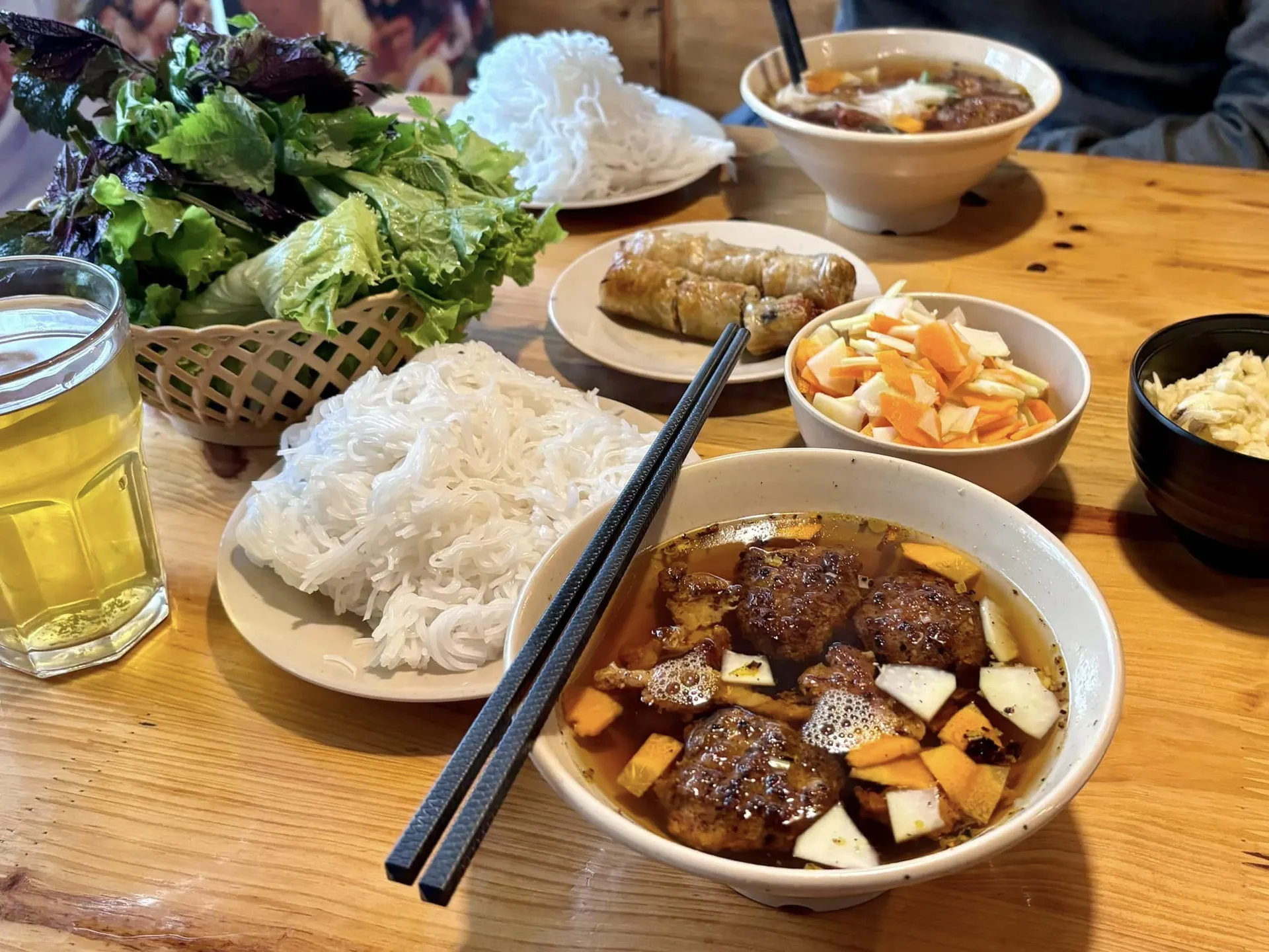 This welcoming eatery is renowned for its faithful take on traditional bun cha with tender grilled pork, flavorful patties, fresh vermicelli and a bold, well-balanced dipping sauce. Its spring rolls, stuffed with pork, crab, or seafood, are also a popular choice.