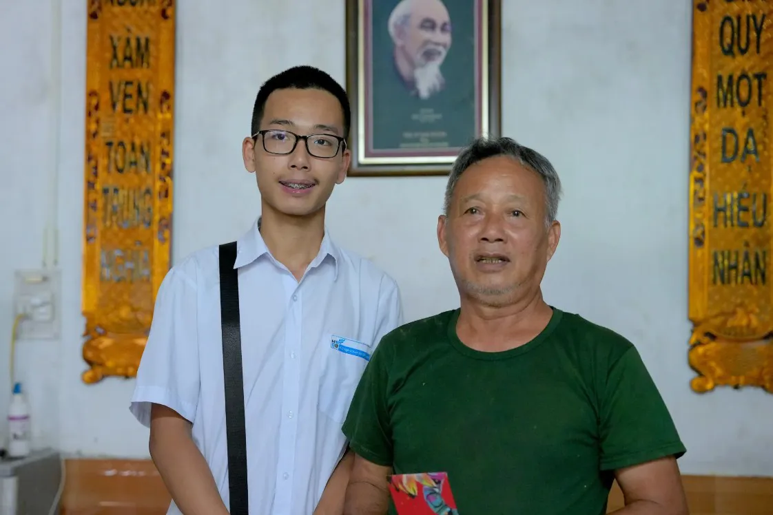 Student Nguyen Huy Long, who donated his scholarship to help flood victims, visits Nguyen Xuan Duong’s family in Trai Cau.