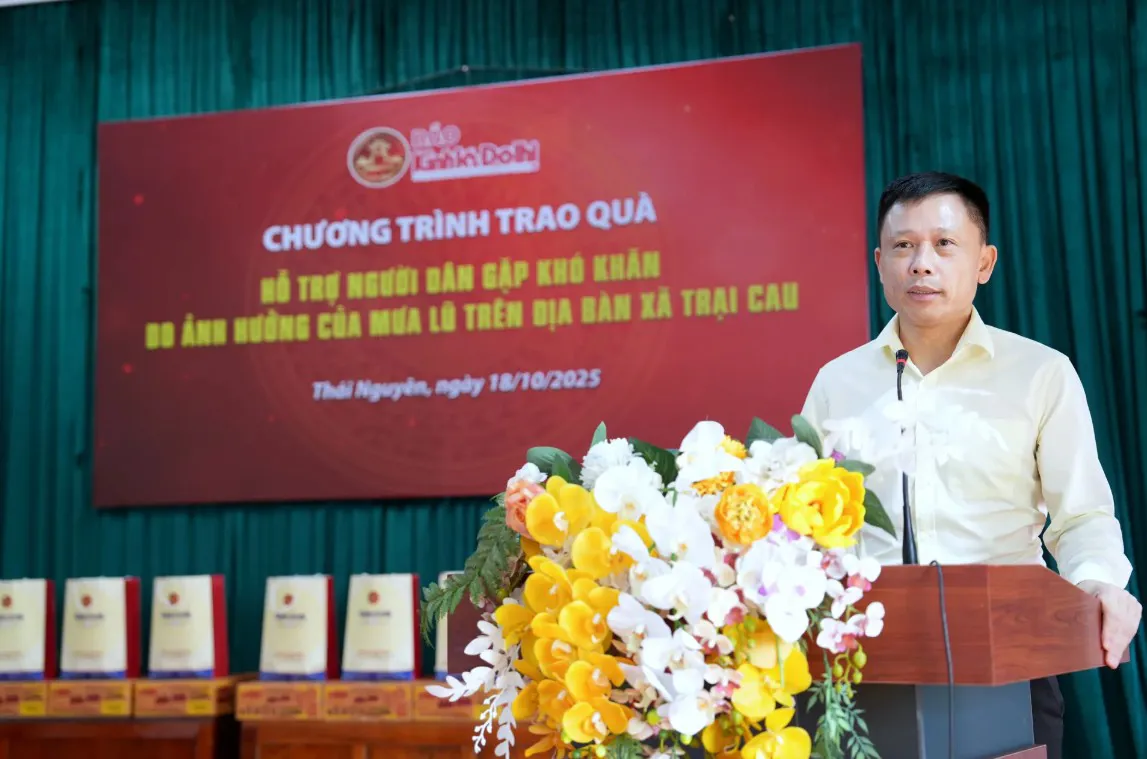 Editor-in-Chief Nguyen Thanh Loi of Kinh te & Do thi Newspaper speaks at the ceremony supporting flood-hit residents in Trai Cau Commune.
