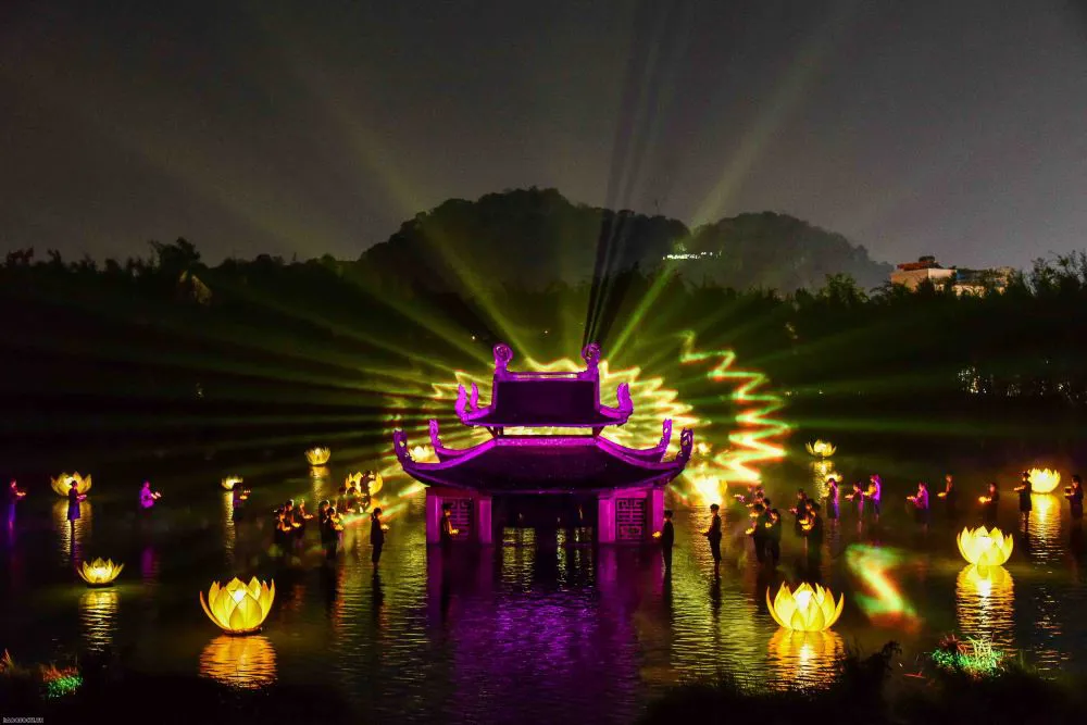 The 4,300-meter square meter stage lying at the foot of Thay Pagoda in Sai Son Commune, Quoc Oai District, about 28 km from the center of Hanoi, provides performances supported by technology of sound, lighting, images, modern equipment, nature storytelling, and the vibrant spiritual life of the ancient Vietnamese community.