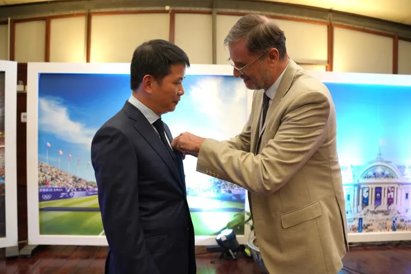 French Ambassador to Vietnam Olivier Brochet awards the prestigious National Order of Merit (Knight rank) to Pham Tuan Long, Chairman of the People’s Committee of Hoan Kiem District. Photo: French Embassy to Vietnam