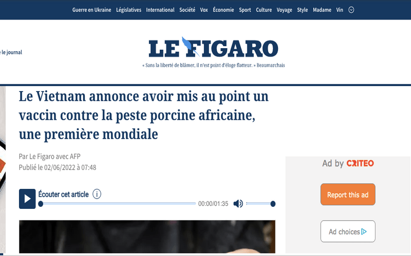 "Vietnam announces it has developed a vaccine against African swine fever, the first in the world", the headline by Le Figaro. Screenshot: Nguyen Ngan |