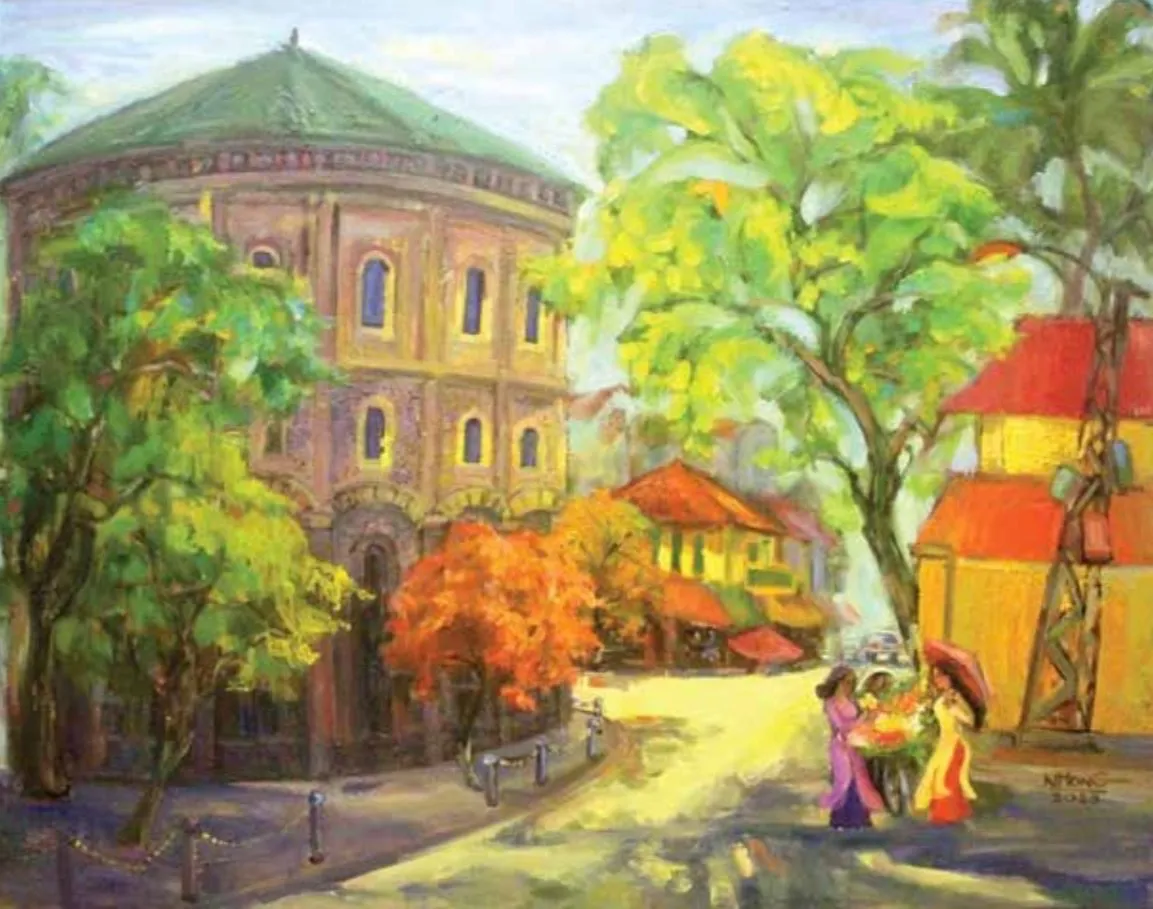 The legendary Hanoi Water Tower rises in Nguyen Bich Hong’s vivid painting.