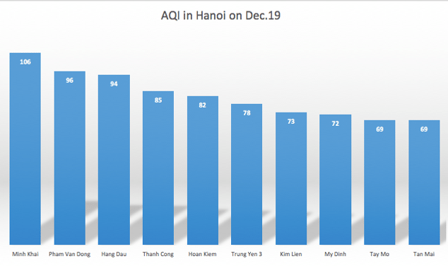 Compared to air quality a day earlier, Hanoi’s AQI decreased and was at the average level in nine locations. Minh Khai’s AQI was recorded at 106, the highest reading for December 19.
