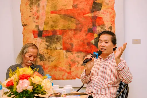 | Painter Nguyen Manh Quynh talks about the artworks painted on giang paper during a talk show in Hanoi. Photo courtesy of Vietnam Museum of Fine Arts |
