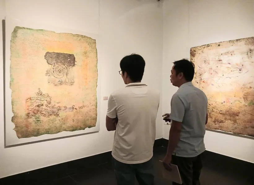 | Visitors contemplate Nguyen Manh Quynh's artworks on giang paper. Photo: giaoducthoidai.vn |
