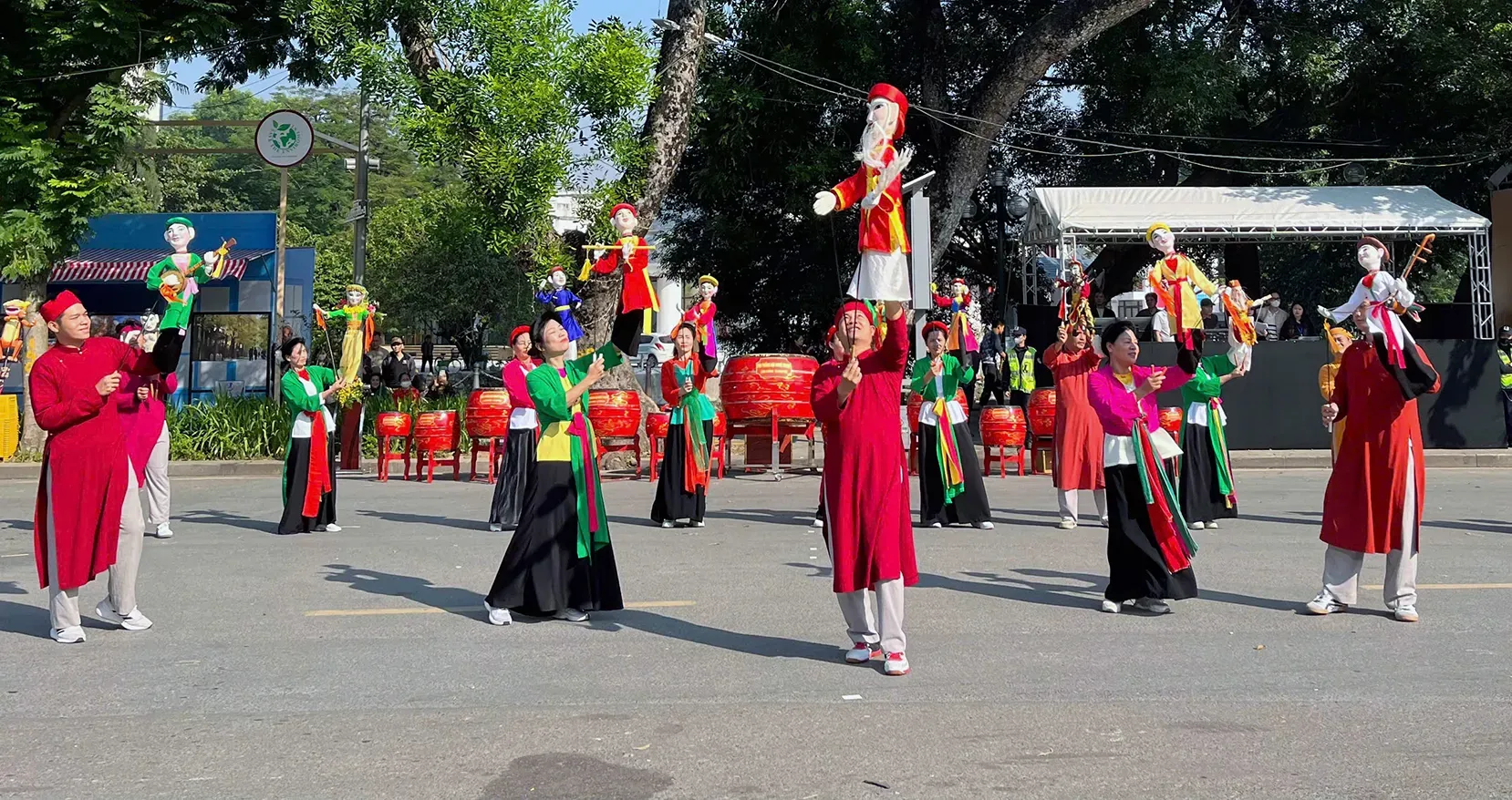 The performance brought together folk art troupes from various localities, offering visitors an authentic journey through Vietnam’s cultural rhythms. Highlights included traditional lion dances, water puppetry, the spirited gong dance of the Muong ethnic minority and the playful “Con di danh bong” performance - where men dressed in women’s attire dance gracefully with drums. The inclusion of modern youth dance groups created an emotional and vibrant fusion of cultural and contemporary artistry, effectively positioning Hanoi as a destination where heritage and creativity coexist harmoniously.