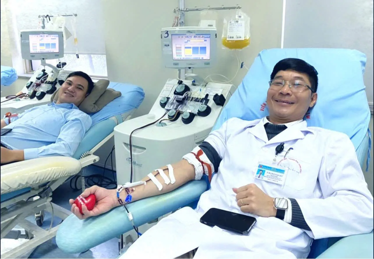 Dr. Tran Ngoc Que, Director of the National Blood Center at the NIHBT, donates blood.