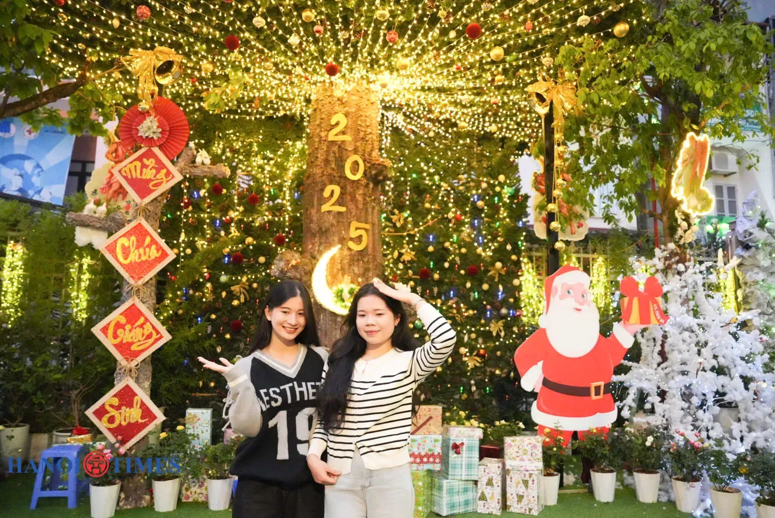Many young people arrived early to admire the decorations and take photos. For Lan Anh and Thu Trang, students at the Hanoi College of Education, the church is well known among Catholics and features a new decorative theme each year.