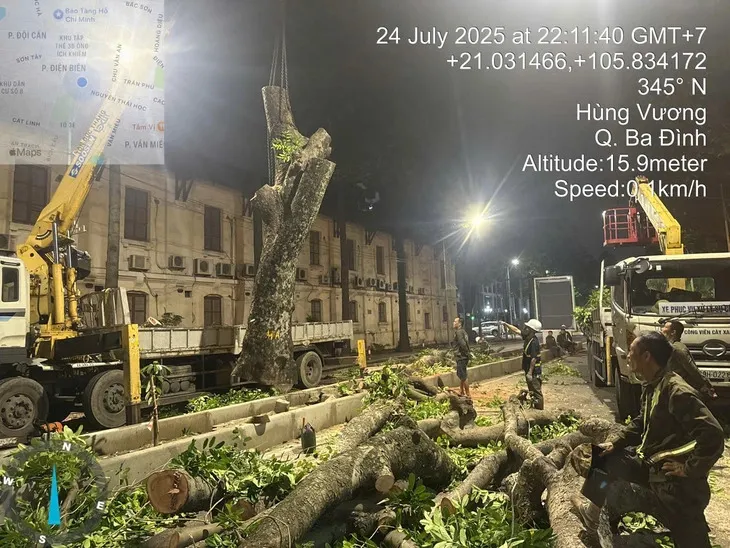 The Hanoi Green Park Company began executing the tree relocation and felling on the night of July 24th, focusing on the stretch from Tran Phu to Nguyen Thai Hoc streets and within Ba Huyen Thanh Quan Garden. This work aligns with an urban enhancement plan to improve the infrastructure and landscape around Ba Dinh Square, a key venue for national events.