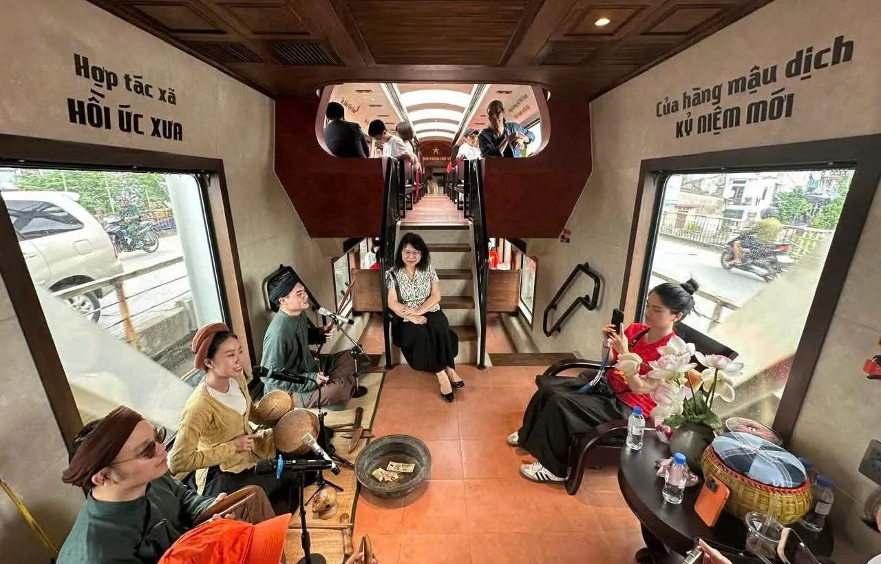 Inside the carriages, a vibrant cultural space showcases the soul of Hanoi with traditional arts.