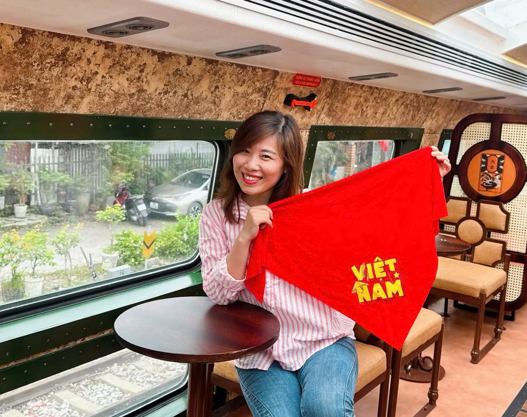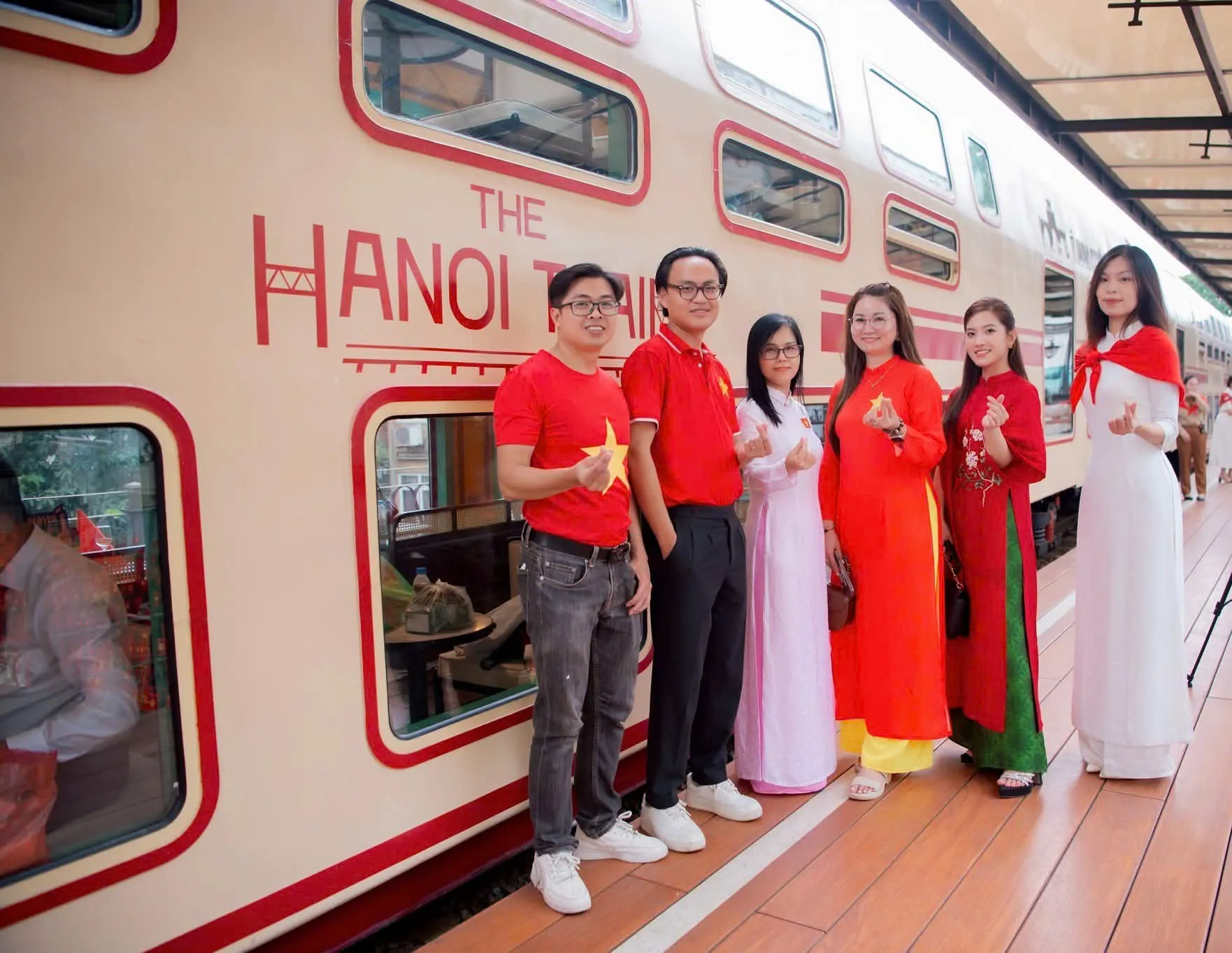 The first tourists wearing outfits patterned national flag experience The Hanoi Train on August 19. Photos: The Vietnam Railway Corporation